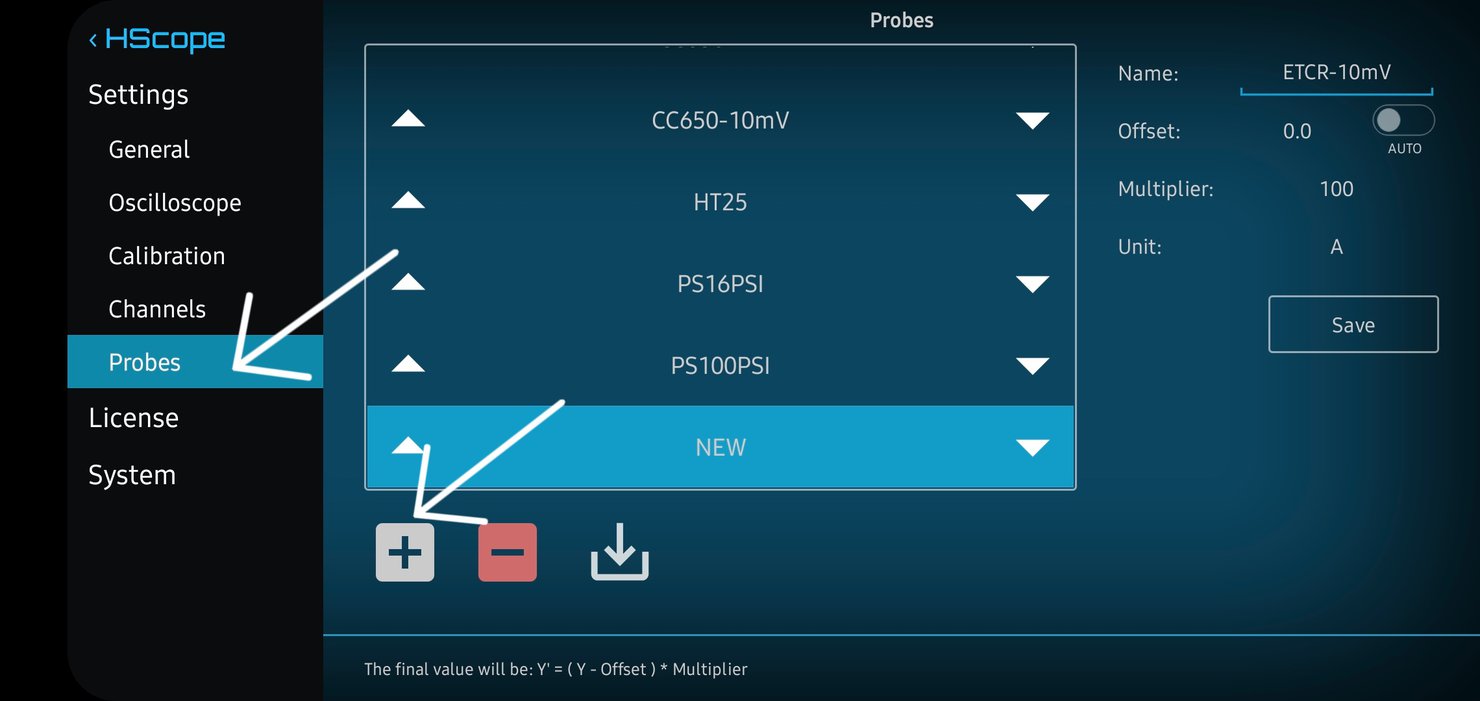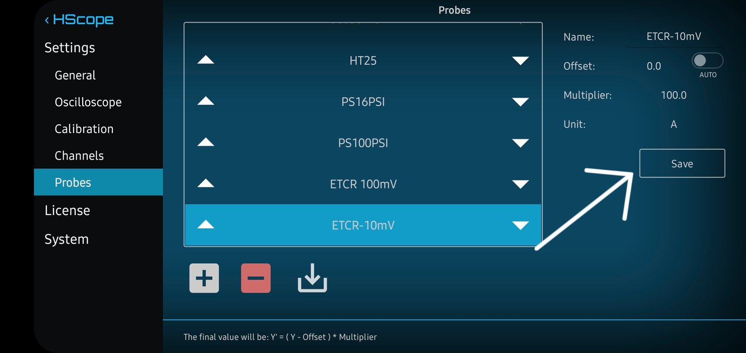 HScope S/W 실행후 -> 자동차아이콘 클릭 (오른쪽 상단) -> 세팅클릭 (화면 오른쪽 아래쪽) -> Probes 선택 -> + 아이콘 클릭 -> Name[ETCR-10mV/A], Multiplier[100], Unit[A] 클릭하여 적절하게 입력후 SAVE 저장 버튼 클릭하여 마무리 함.