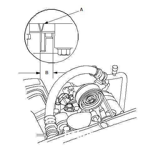 ホンダオートテンショナーにはオートテンショナーインジケーター矢印マーク(A)が付いています。 図面に示されているように、このインジケータマークが許容範囲(B)内にある場合、ドライブベルトまたはサーペンタインベルトを交換する必要はありません。 ただし、インジケータの矢印マークが許容範囲外の場合は、ドライブベルトを再確認して交換する必要があります。 もちろん、ひび割れがないか確認し、目視検査も行う必要があります。